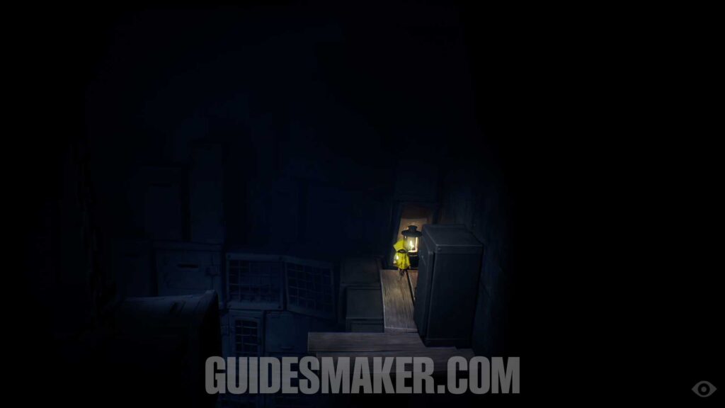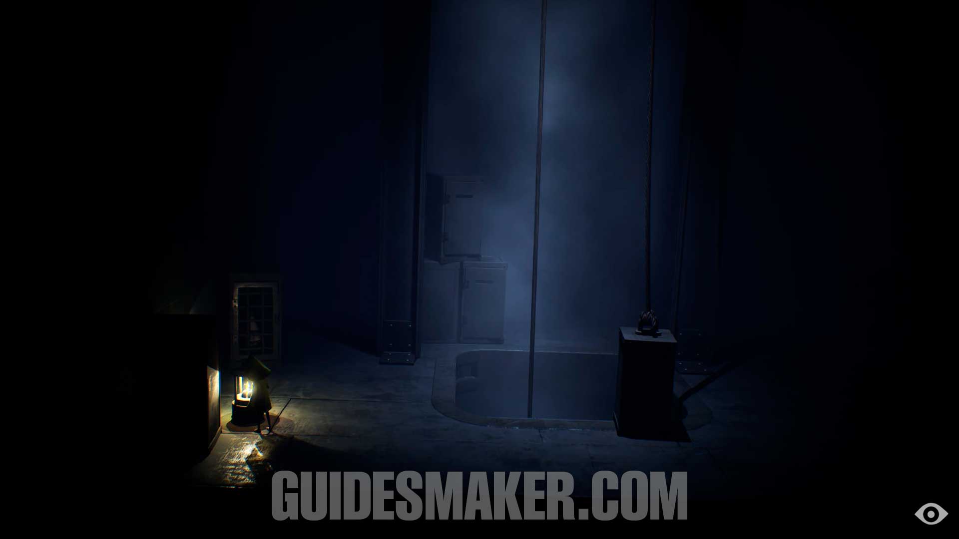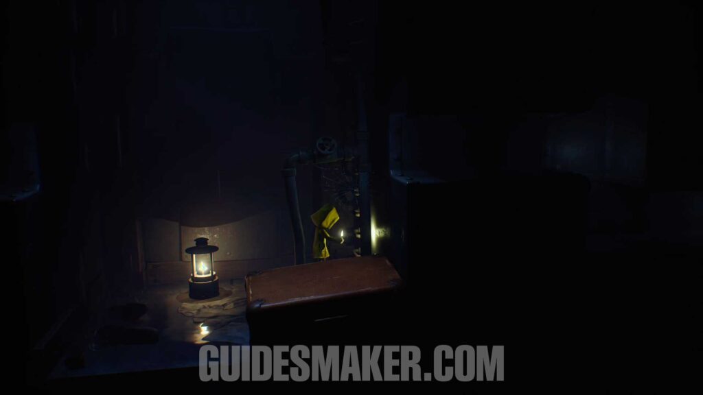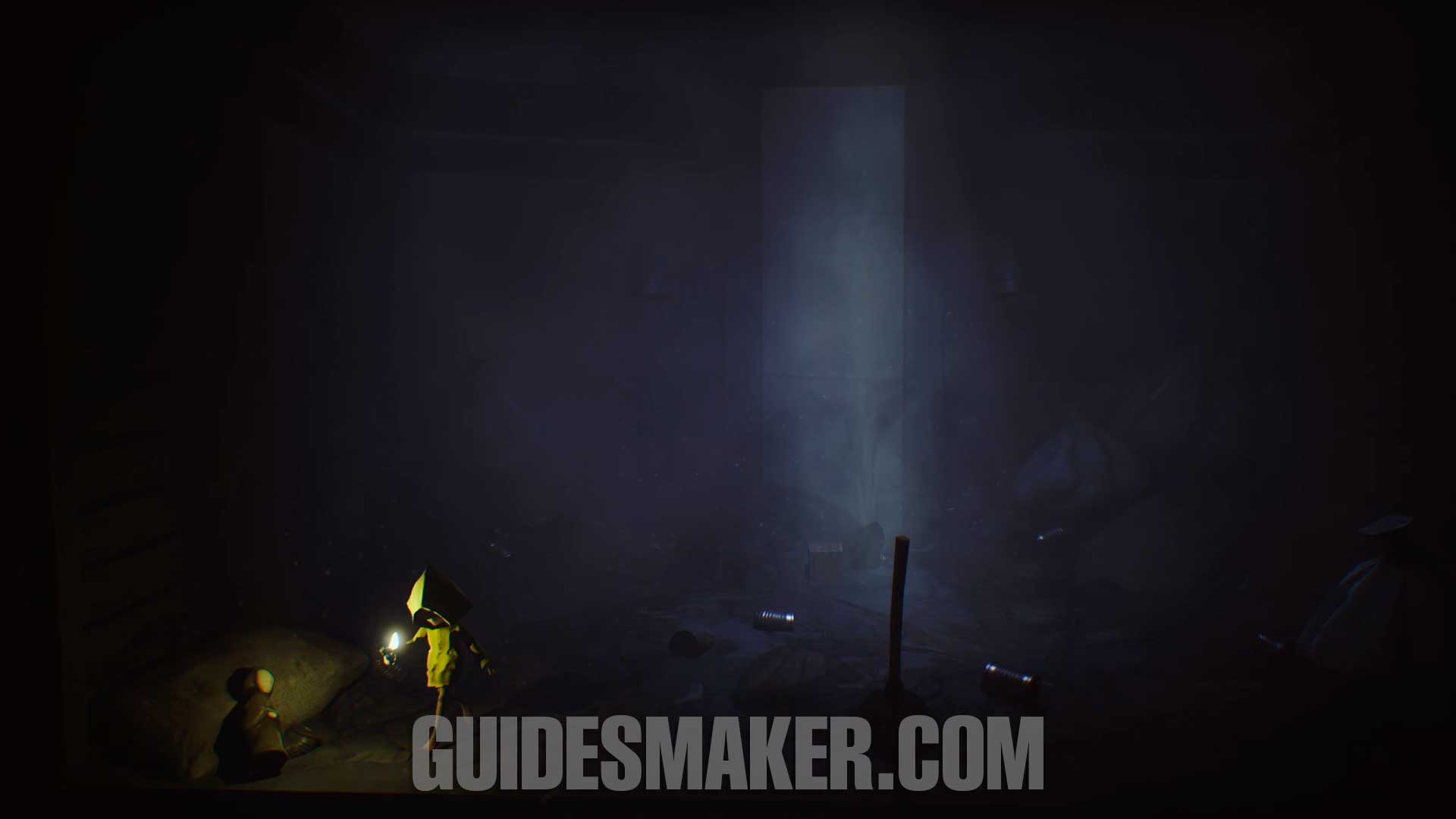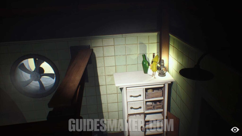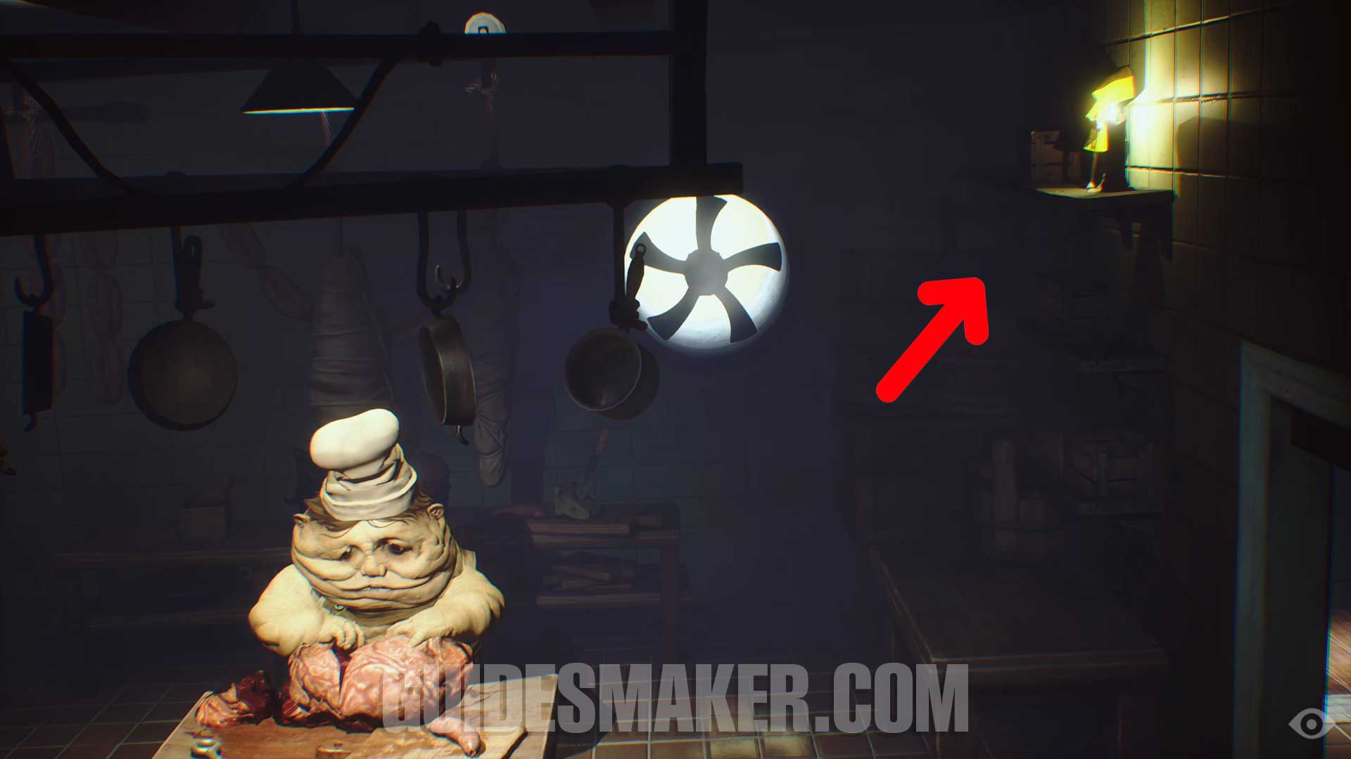 After taking the elevator up again, you will have to hide from the monster. After that, climb onto the shelves on the right side of the kitchen to activate this light point.