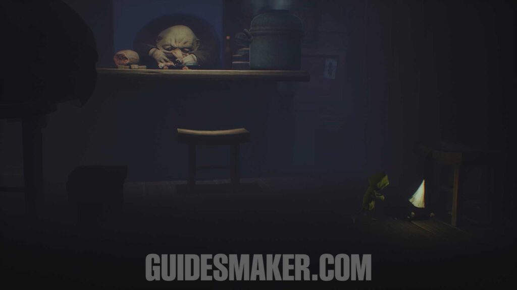 After climbing to the top of the ship using the chain, you’ll reach the mess hall. The natural path would be to climb onto the table, but first you’ll see a gnome running into a hole in the wall. Pull the bench and crawl through the hole to find another Light point and the gnome inside.