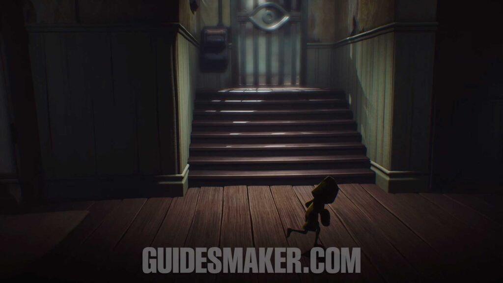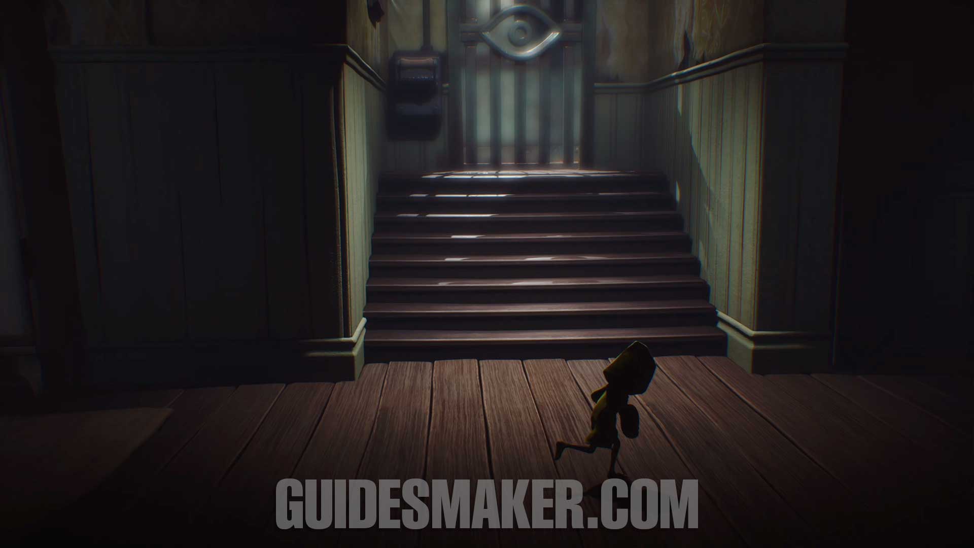 After turning on the light point, drag the chair onto the pressure plate on the floor. This will cause the door on the right to open. Go through the door and walk around the room so the gnome runs out. After it runs out, return to the stairs and you will find it on the staircase. Climb up and you can find it next to the door.